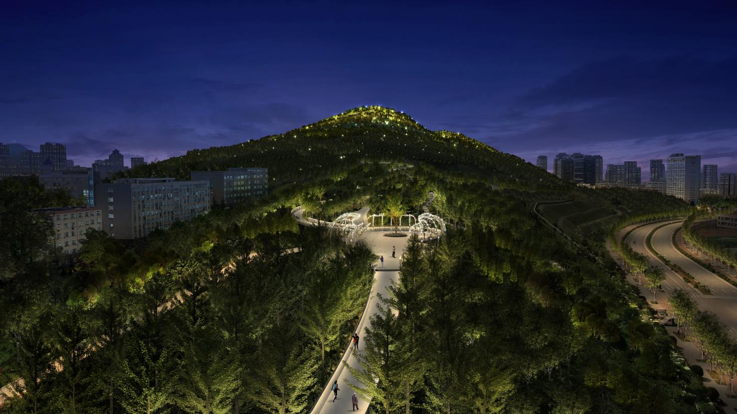 項目范圍包含綢帶公園和東西綠廊(包括五頂茂陵山)開放空間景觀,其中綢帶公園南起經(jīng)十路北車工業(yè)南路,總面積約 556000 平方米,兼顧各視角場景照明效果,展現(xiàn) CBD 商務(wù)區(qū)夜景風(fēng)采改善人民夜間生活環(huán)境。
